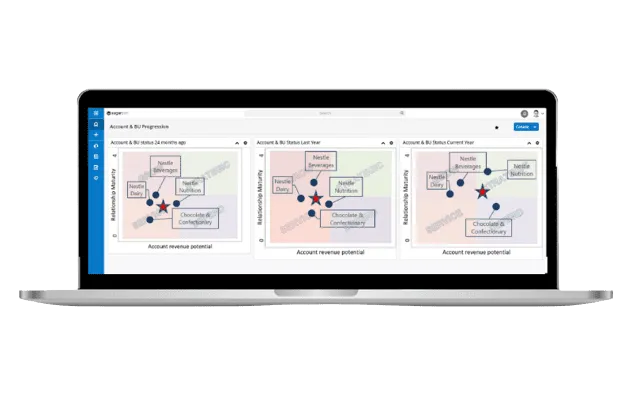With SAM (Strategic Account Management) plans, you can now measure BU relationship strength and the active players involved. With a visible relationship chart, a quick look shows the current status of the account. You can also see how attractive a particular BU is to your business.