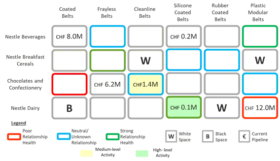 Product-BU view overlapped with relationship status, opportunities to grow new connections, and the level of activities is an indispensable asset for business leaders planning to grow sales. One view that both marketing and sales teams can relate to when working on strategic accounts.